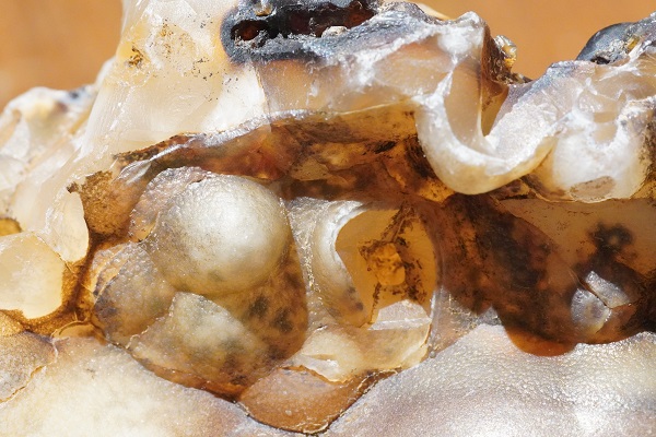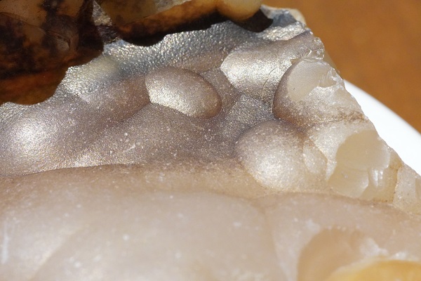 成因はたぶん、熱水から固化したメノウがまだ固まらぬうちに下からガスが湧き上がって抜けて行ったのだろうと。ぶくぶくと。