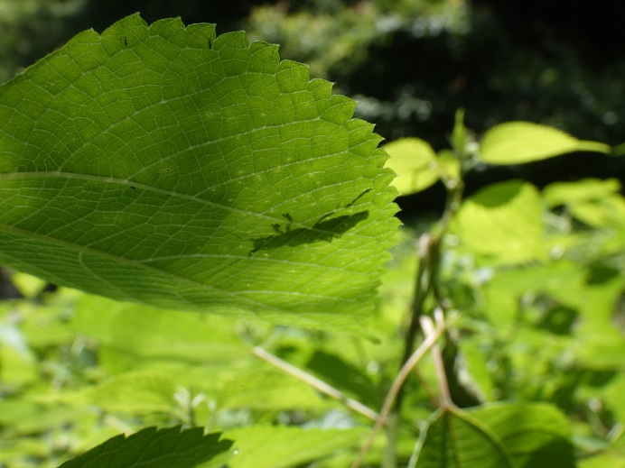 なんてそぞろ歩く傍らにカラムシ(イラクサ科)のやぶ。まあ珍しくもない「雑草」です。しかしその葉裏に何かいるのに気付いてしまった。