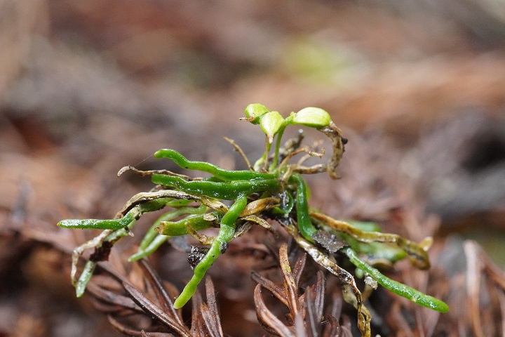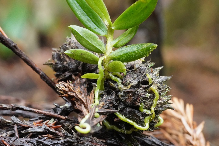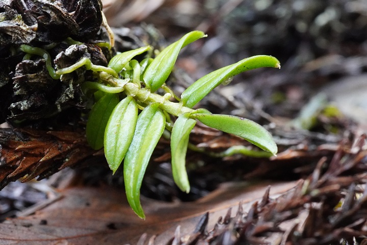 さっそくカヤラン。幼い個体です。今回はこのようにスギの球果に付いていてもろともに落ちるものが多かった。根付く場所を選べないもんなあ。