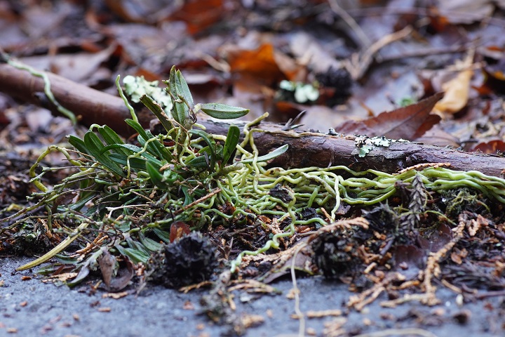 世にはグリーンフィンガーと呼ばれる方々がおられます。「植物を育てるのが上手な人」という意味だとか。実際に私がここで拾ったカヤランを差し上げたらその後何年も開花させている人がいます。でも私は駄目。すぐ枯らしてしまいます。水と陽を十分与えるとコケや地衣類に覆われてしまうとか、地面近くに置いたらワラジムシに残さず食われたとか、かえって不幸な状況にしてしまうばかりです。もう拾って救うことは諦めています。せめて車道上のを茂みに移してやる程度。そしてカメラを構える。