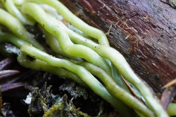根がうにうにとああ気色いいなあ。緑色なのは根でも光合成するから。ちなみに、多くのランと同じようにこのカヤランにもちゃんと生育を助ける共生菌類がいます。地上で生きられないのはこの菌類が死滅しちゃうのが原因かも。