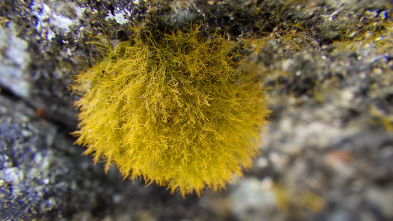 わあ、岩一面にスミレモ。気生の緑藻ですけど、こんな自然の場所に群生するのは珍しい。普通は山中の忘れ去られたような祠の石垣に付いています。