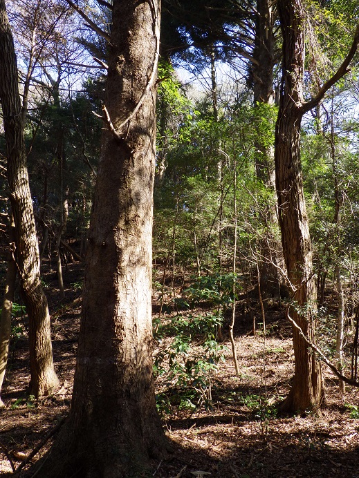 それではと今日は林道を越え、峠に向かう山道を行ってみました。初めての領域です。するとぽかりと、巨樹の茂る森に出ました。おおお。我が聖なるツクツク森にどことなく似ています。これ、こういう森を探していたんです。ダンジョンの宝箱にたどり着いた気分です。これで夏に再訪して冬虫夏草があったなら今日のこのクエストは大成功ということになります。なんか調子出てきたぞ。