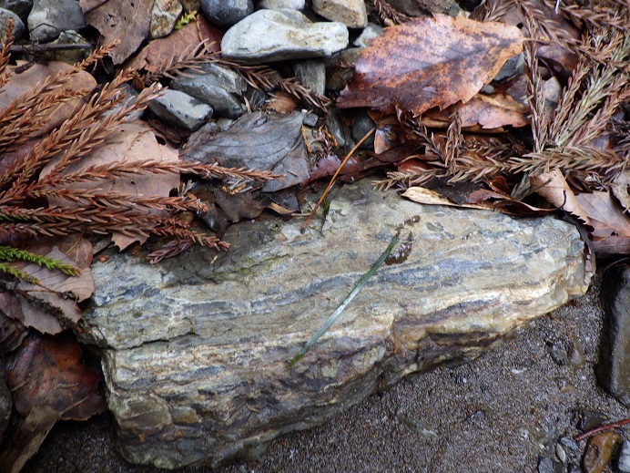 ここでメノウというのは想定外でしたが、あって不思議ではありません。そういう眼であたりを見回してさらに何個か見つけましたが、まあ持ち帰るほどでは。ちなみにこの層状に石英が貫入したメノウ、掘り出してひっくり返したら