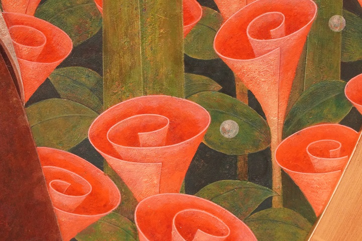 で、皆さまもうお気づきのことと思います。高鳥先生の一貫したモチーフが「螺旋らせん」であることに。展覧会のタイトルにもありますね。もうほとんどの絵のどこかしらにぐるぐるがあるんです。そりゃあもうしつこいくらいに。