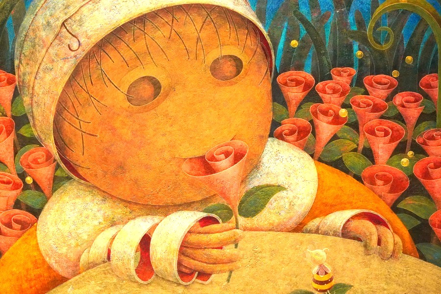 テンペラ画は油彩画より古い絵画技法です。本来水や油に溶けない顔料を、乳化作用のあるタンパク質を用いて絵の具にします。具体的には卵を溶いたりニカワを煮込んだりして顔料を混ぜ込むという何だか画面がニオいそうなカビそうな技法ですが、もちろん防腐処理をします。特徴は何と言っても経年劣化に強いこと、変色しづらいこと。中世に描かれた有名作品、例えばアンジェリコ「受胎告知」、ボッティチェリ「春」「ヴィーナスの誕生」はみなテンペラ画。500 年経っても色褪せていません。そして現代でもテンペラ画が描かれるのは、油絵に勝り日本画とも違うその落ち着いた質感が好まれるからです。