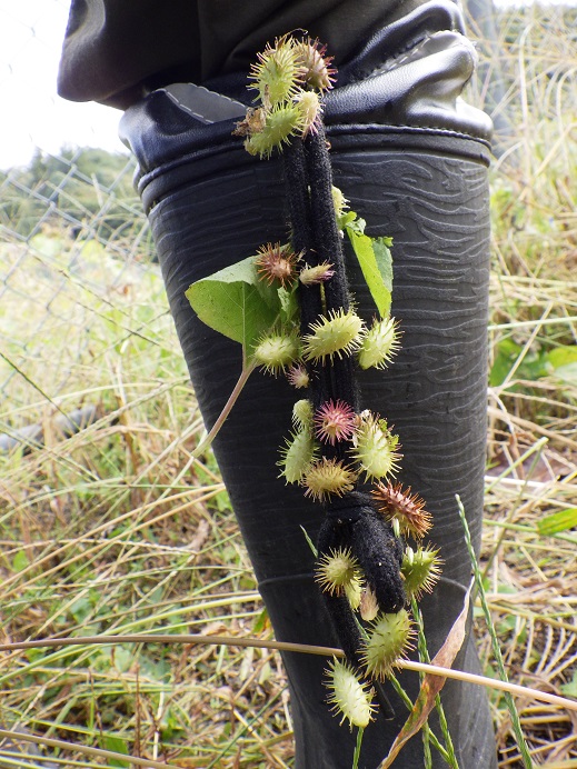 草刈りしてないあぜを歩いたらオオオナモミの洗礼を受けました。いわゆるひっつき虫の一つ。