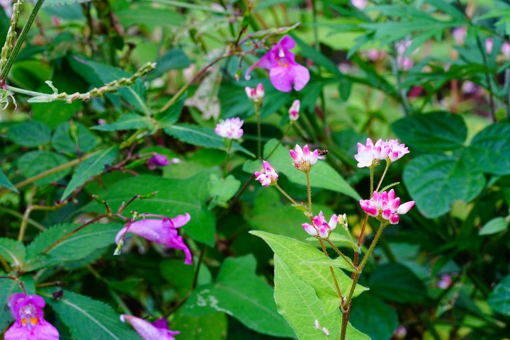 田んぼのふちにミゾソバとツリフネソウ。なんとなく大造りなツリフネソウよりも