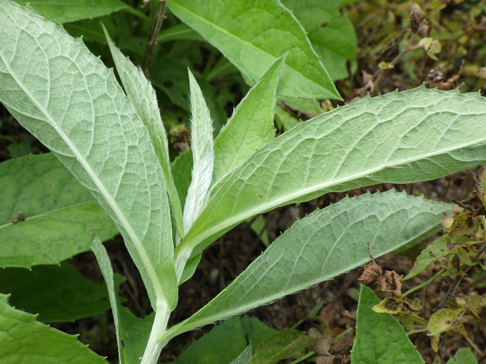 私がメインで分類・同定の参考にしているのは山と渓谷社「野に咲く花」です。カセンソウとオグルマの相違点が葉で述べられてます。いわく、カセンソウは「裏面は脈が隆起して目立つ」。オグルマは「裏面の脈は隆起しない」。さて玉川のは